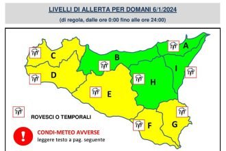 La Protezione Civile ha diramato un’allerta meteo gialla per la giornata di domani, 6 gennaio, in Sicilia a causa del maltempo che interesserà tutta l’isola. Sulla base delle previsioni meteo, sono attese piogge sparse, anche a carattere di rovescio o temporale, in particolare sulla Sicilia meridionale e occidentale, con quantitativi di pioggia cumulati da deboli a localmente moderati.