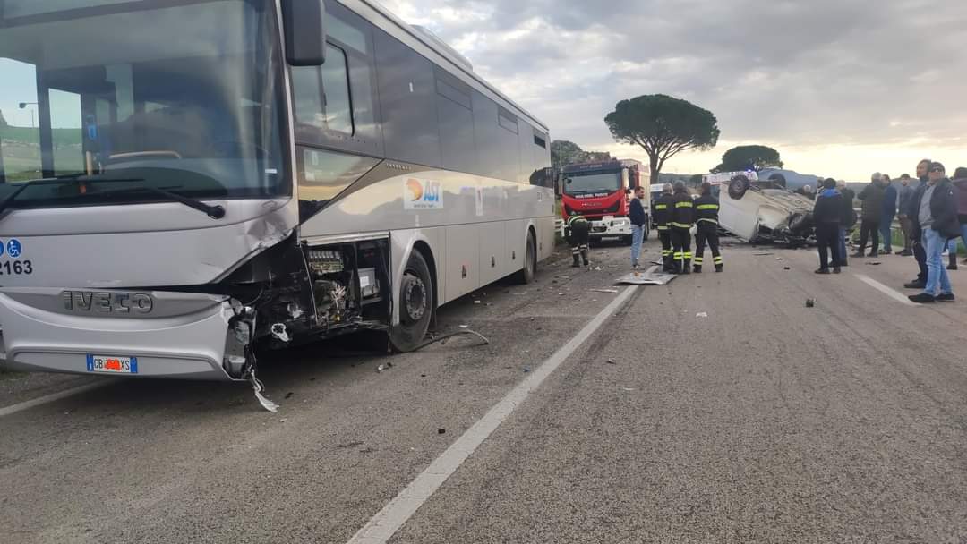 Secondo una prima ricostruzione, un furgone, mentre tentava di superare un pullman dell’Ast, ha iniziato a sbandare finendo per scontrarsi frontalmente con un’altra vettura che procedeva in senso opposto. L’impatto, che ha provocato anche il ribaltamento del furgone, è stato molto violento.
