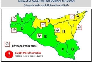L’avviso prevede precipitazioni, anche a carattere di rovescio o temporale, concentrate soprattutto sui settori tirrenici centro-orientali dell’isola. Dalle prime ore di domenica 15 dicembre, e per le successive 12-18 ore, si prevede il persistere di queste precipitazioni, con rovesci di forte intensità, frequente attività elettrica e forti raffiche di vento.