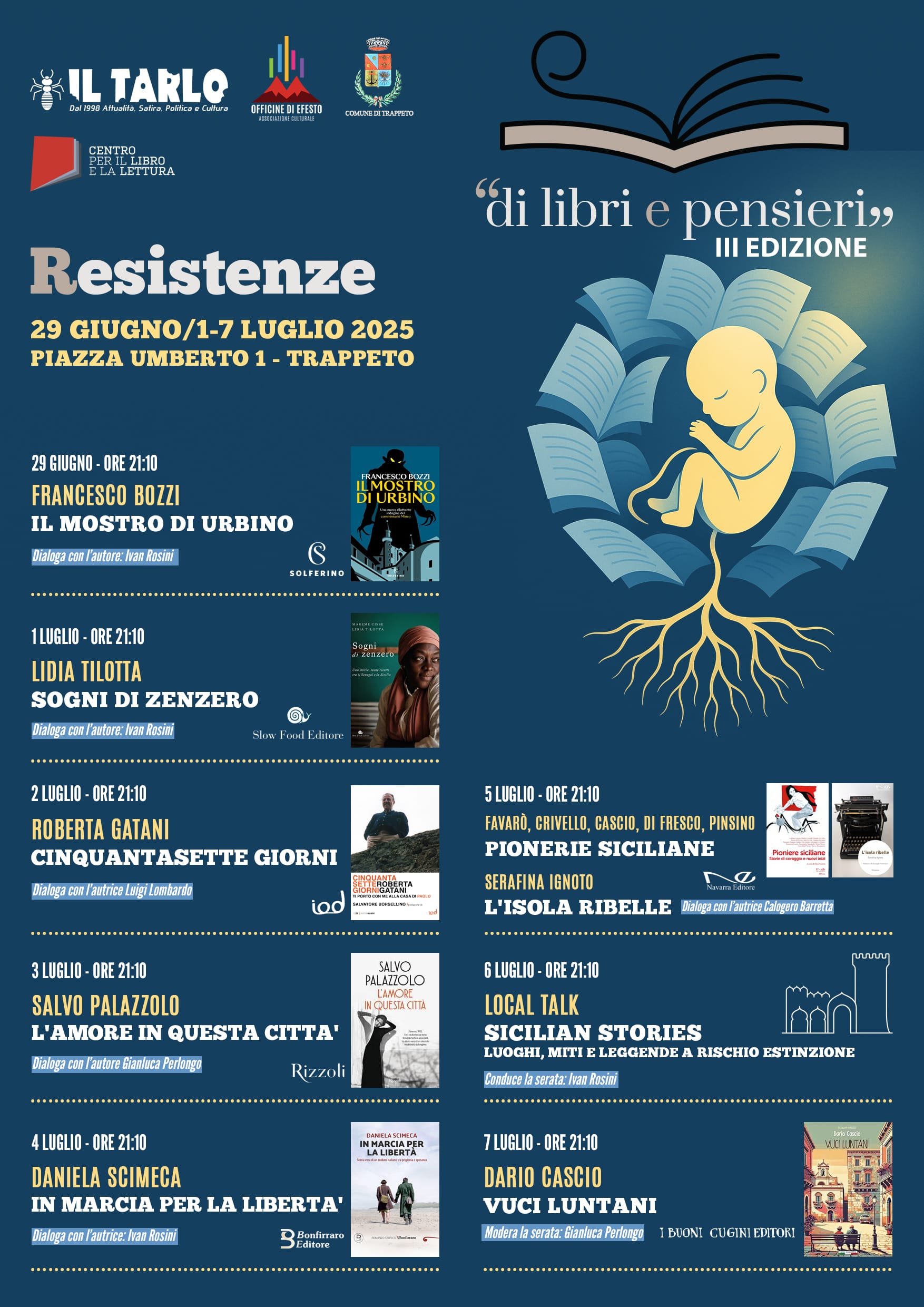 Promossa dal quotidiano di inchiesta “Il Tarlo” e dall’associazione culturale “Officine di Efesto”, con il patrocinio del Comune di Trappeto e sotto gli auspici del centro per il libro e la lettura, l’edizione 2025 si svolgerà dal 29 giugno al 7 luglio, con un programma denso di incontri, riflessioni e narrazioni che intrecciano letteratura, memoria, impegno civile e identità.