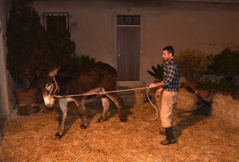 La rappresentazione della Natività si svolge nel cuore del centro storico, dove il complesso di antiche abitazioni in pietra si trasforma in una vera e propria macchina del tempo. Varcato l’ingresso di via Coffari, il visitatore ha la sensazione di immergersi in un’altra epoca. Le stradine, le cantine e le vecchie stalle, un tempo abitate dalle famiglie del quartiere, tornano a vivere grazie ai circa duecento figuranti che, indossando abiti dell’Ottocento e del primo Novecento, ricreano scene quotidiane della tradizione contadina locale.