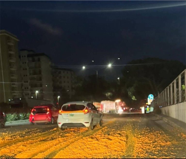A complicare ulteriormente la situazione la pioggia caduta in quelle ore, che ha reso il manto stradale particolarmente viscido e quindi pericoloso per la circolazione dei veicoli. Per questo motivo si è reso necessario l’intervento della polizia municipale, intervenuta con una pattuglia per regolare il flusso veicolare e mettere in sicurezza la zona. Successivamente una squadra di operai ha dato il via alle operazioni di rimozione del carico disperso e alla pulizia del tratto interessato.